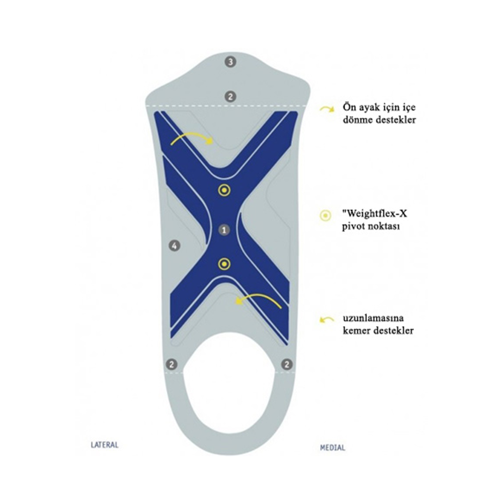 ErgoPad® weightflex ortopedik ortezi, tabanlığın ortasında değişik sertlik seviyelerine sahip iki çeşit plastiğin kombinasyonundan mamüldür. İç kısımdaki çarpı şekilli “weightflex-x” bölümü kişinin ayak durumuna, teröpatik hedefe ve vücut ağırlığına göre değişik destek çözümleri sağlar. Tabanlığın ön ve topuk bölümündeki özel menteşeler sayesinde tabanlık hem düşük hem de yüksek topuklu ayakkabılarda rahatlıkla kullanılabilir forma girer.